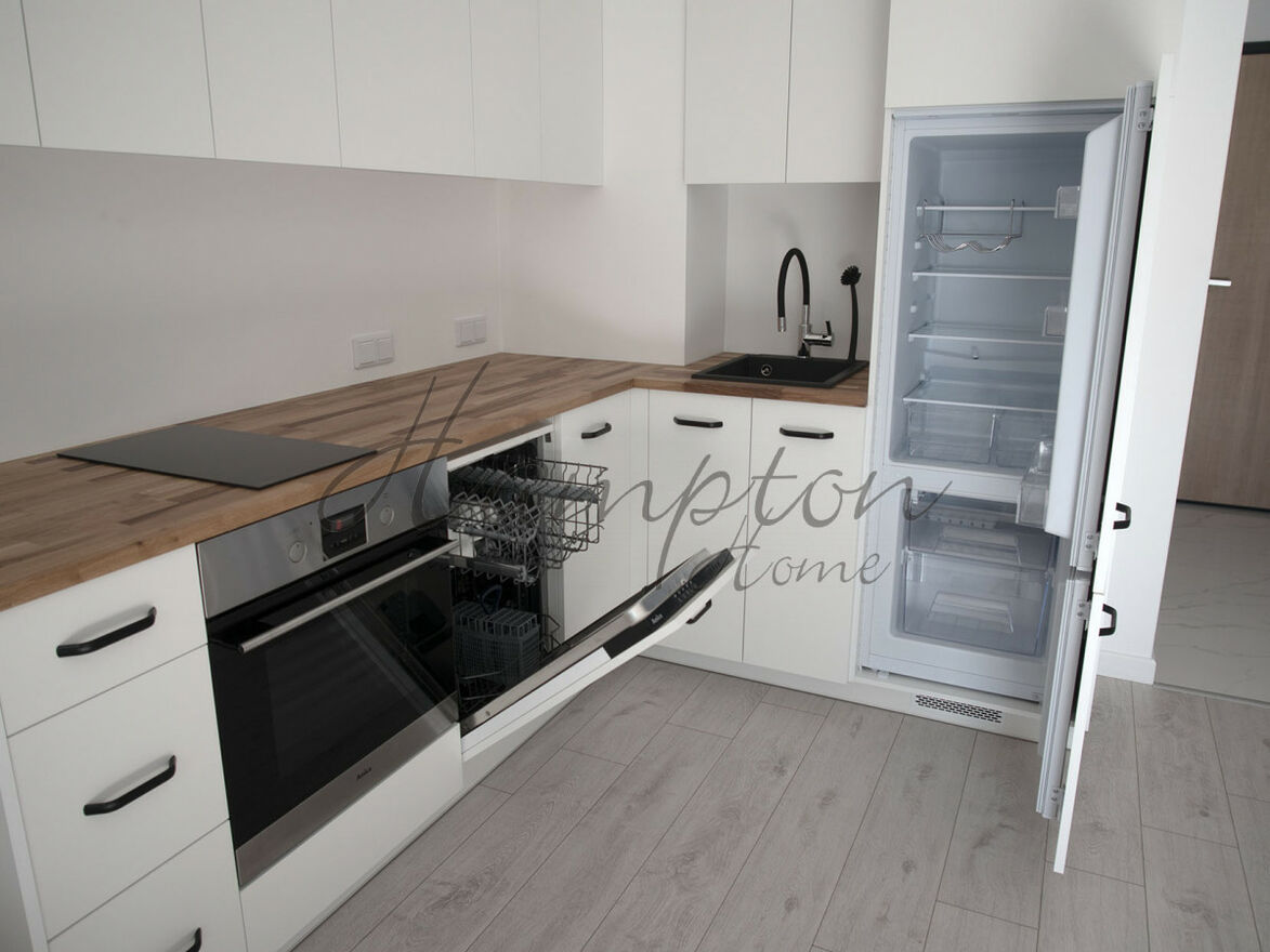Mieszkanie w pełni wyposażone i gotowe do zamieszkania o ekspozycji zachodniej. Panoramiczne okna zapewniają dużo światła w mieszkaniu. W salonie znajdziemy sofę z funkcją spania, stół oraz dwa krzesła. Meble kuchenne białe, blat dębowy, całość robiona na zamówienie. Lodówka i zmywarka w zabudowie, oraz piekarnik i płyta indukcyjna